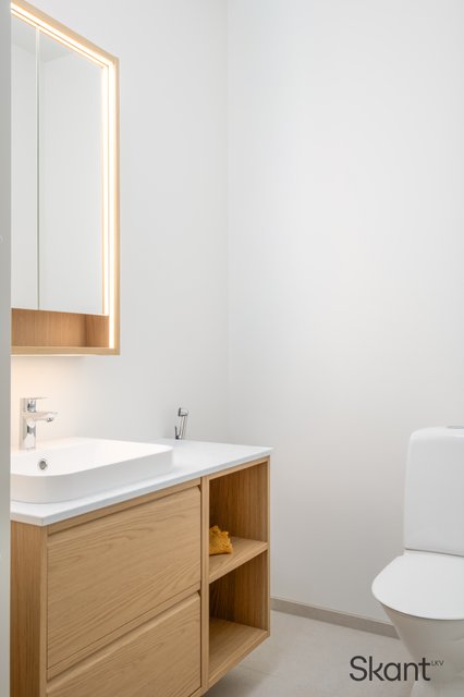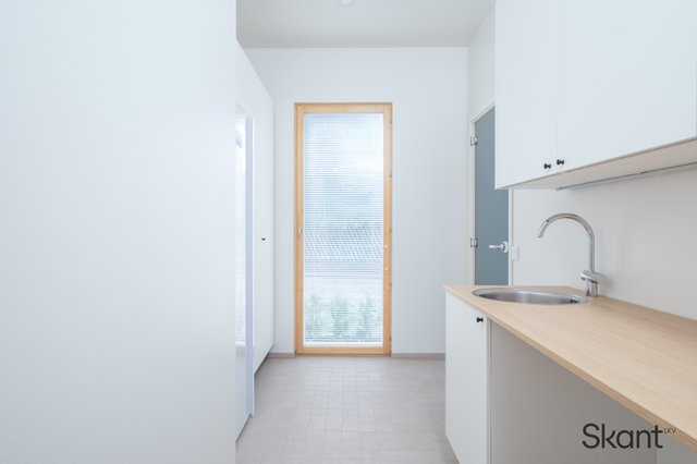 - Kuivauskaappi, pesukoneliitäntä, lattiakaivo, pyykkikaapit, lattialämmitys, pöytätaso, ja pesuallas