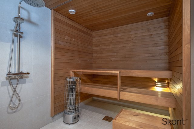 - Saunan seinät ja katto lämpökäsitelty leppä 15x90 STS. Lauteet lämpökäsitelty leppä. Saunan ja kylpyhuoneen välissä kirkas lasiseinä.