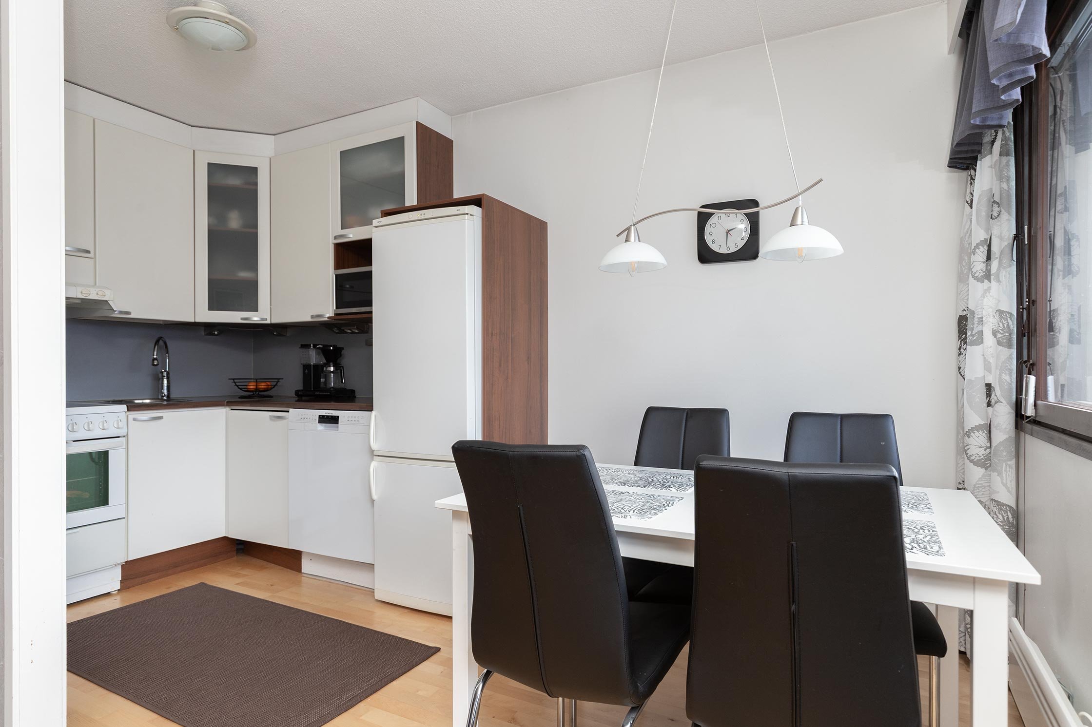 Kodissa on käytännöllinen pohjaratkaisu, jossa olohuone ja keittiö yhdistyvät saumattomasti. Kompakti keittiö on varustettu laadukkain kodinkonein, asunnon lattiat ovat parkettia. Makuuhuoneessa on runsaasti säilytystilaa, ja kylpyhuoneessa on lattialämmitys ja kuivauskaappi.