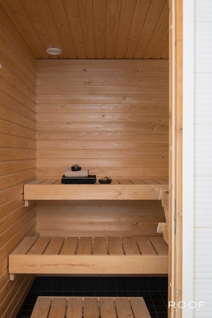 - Kuvaus, lisätiedot ja varustus Sähkökiuas, Lattia laattaa ja seinät puupanelia