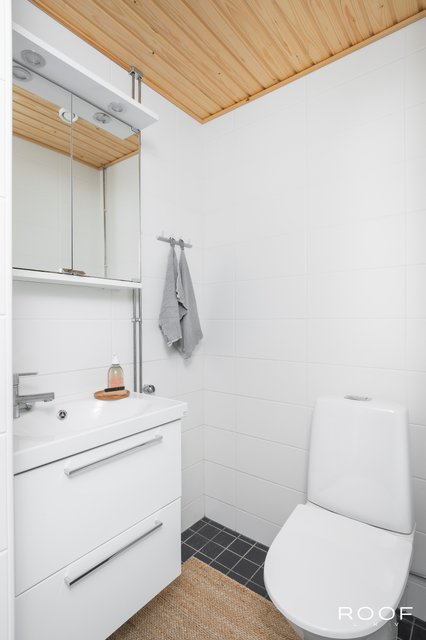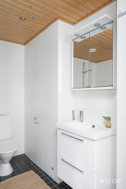 - Wc-istuin, suihku, pesukoneliitäntä, peilikaappi, kiinteät valaisimet, lattia laattaa ja seinät kaakelia