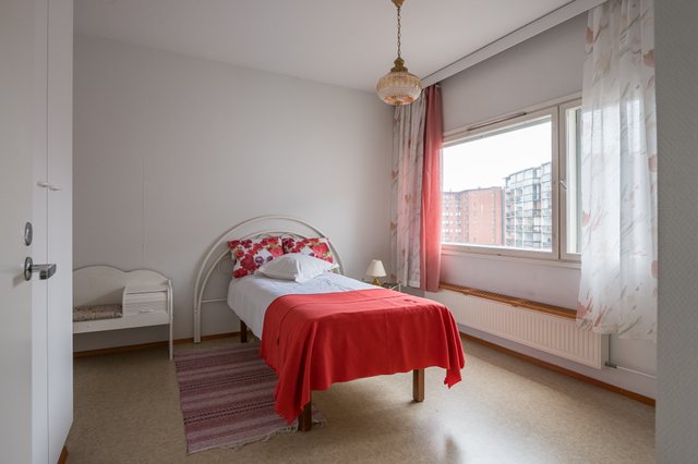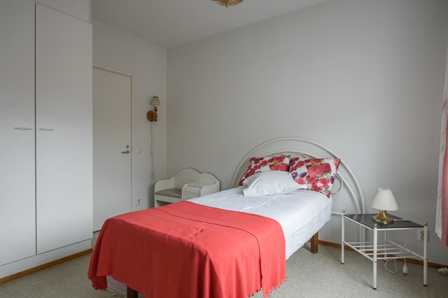 Asunnon makuuhuone on reilunkokoinen ja kiinteät kaapistot sekä erillinen vaatehuone varmistavat, että säilytystilaa on runsaasti. Kylpyhuone on käytännöllinen, hyvin varusteltu ja siihen kuuluu myös oma sauna.