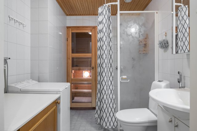 - WC-istuin, suihku, pesuallas, peilikaappi, allaskaappi, ja bidee-suihku
