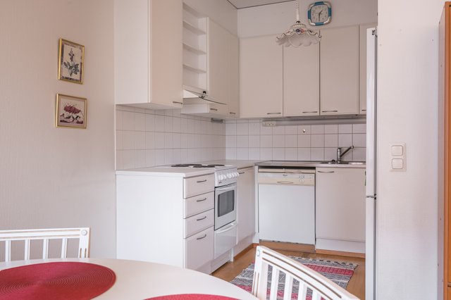 - Vaaleasävyinen keittiö reilulla kaappi- ja laskutilalla. Ruokailutila keittiön yhteydessä