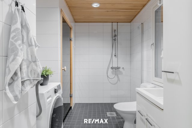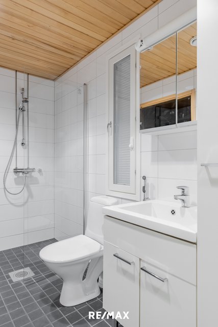 - WC-istuin, suihku, suihkuseinä, pesukoneliitäntä, lattialämmitys, peilikaappi, pesuallas, allaskaappi, ja bidee-suihku