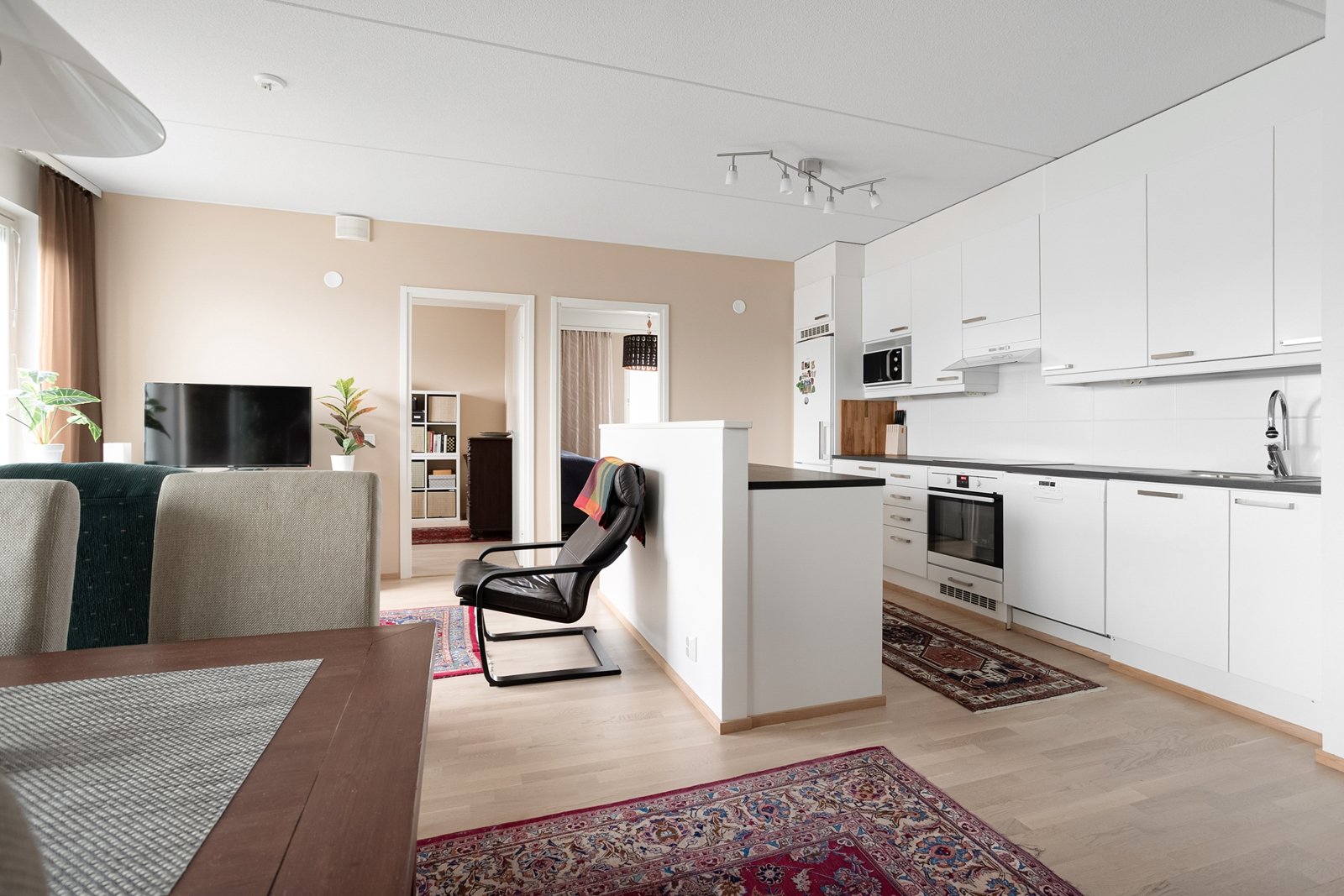 Keittiö on varustettu laadukkailla kodinkoneilla, kuten induktioliedellä ja erillisellä uunilla, ja sen yhteydessä on käytännöllinen saareke. Kaksi makuuhuonetta tarjoavat mukavasti tilaa perheelle tai työtilaksi. Kylpyhuone on tilava.