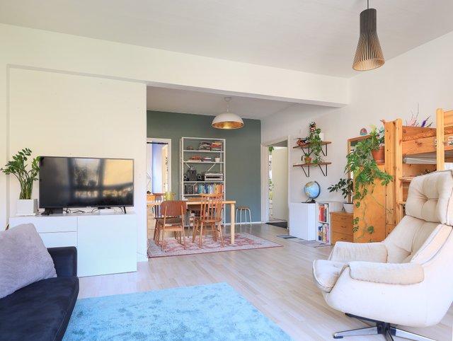 Ihastuttava koti, jonka keskiössä on tilava oleskelutila, jossa yhdistyy olohuone sekä ruokailutila. Vaalea keittiö, jossa on myös tilaa