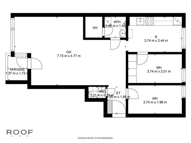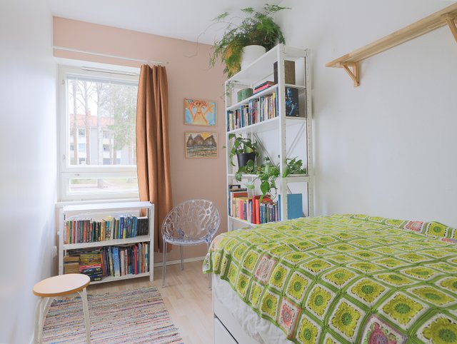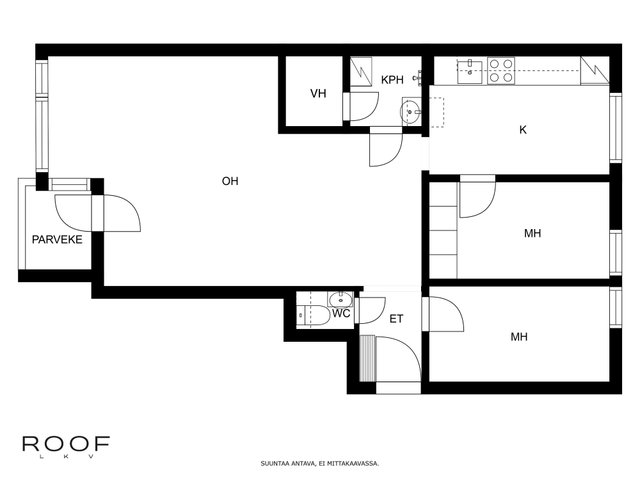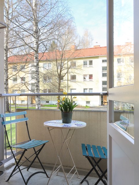 aamiaispöydälle. Olohuoneesta on käynti parvekkeelle, josta on vehreät näkymät. Kaksi hyvän kokoista makuuhuonetta. Kylpyhuoneessa on tilaa pyykinpesukoneelle, josta on käynti vaatehuoneeseen. Eteisen yhteydessä on erillinen wc.