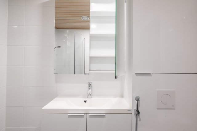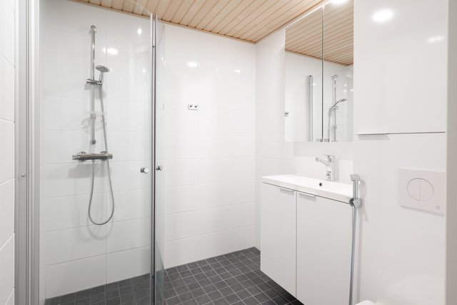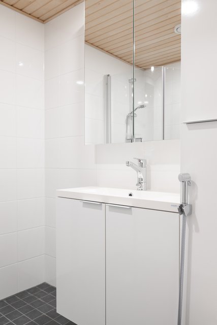 - Kylpyhuoneen varustuksena suihku, suihkuseinä, wc-istuin, pesukoneliitäntä, peilikaappi, allaskaappi, bidee-suihku, lattialämmitys. Lattia- ja seinäpinnat laattaa.
