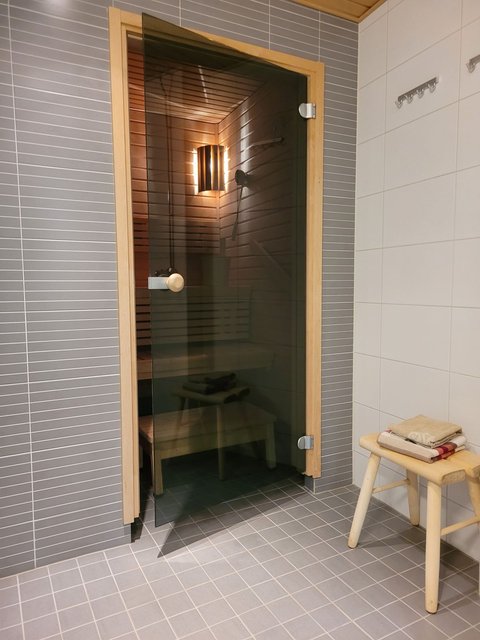 - WC-istuin, suihku, pesukoneliitäntä, lattialämmitys (sähkö), peilikaappi, pesuallas, allaskaappi, ja suihkuseinä