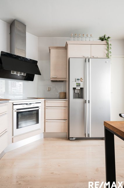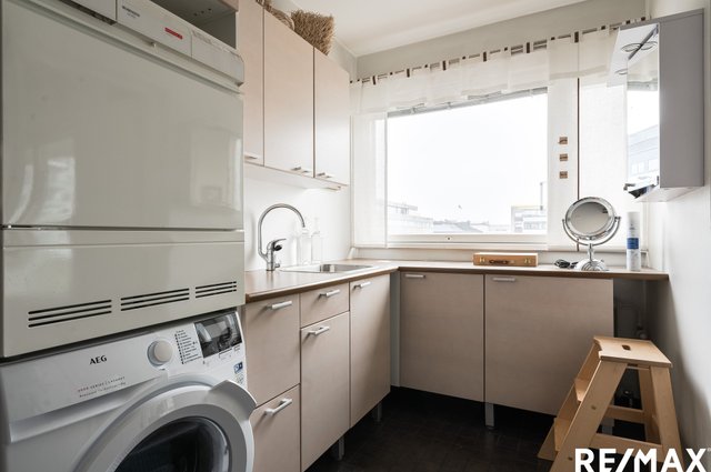 - Keittiö on uusittu kodinkoneineen vuonna 2010. Varustukseen kuuluu Side by side jääkaappi/pakastin, induktioliesi, liesituuletin, kiertoilma uuni, astianpesukone, kalusteisiin upotettu mikro. Seinät on maalattu ja lattia on laminaattia. Keittiöstä käynti parvekkeelle.