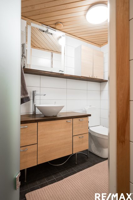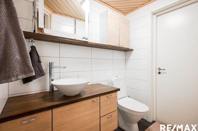 - Wc on remontoitu vuonna 2010. Varustukseen kuuluu peilikaappi, allaskaapisto, kiinteät valaisimet. Seinät ja lattiat on laatoitettu. Tilassa on sähköinen lattialämmitys.
