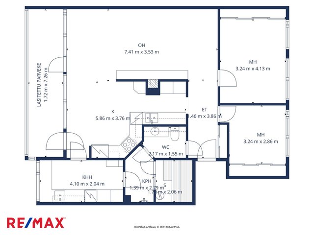 - Isännöitsijäntodistuksen mukainen, Yhtiöjärjestyksen mukainen, (Pinta-ala ei ole tarkistusmitattu ja todellinen pinta-ala voi olla suurempi tai pienempi, kuin ilmoitettu)