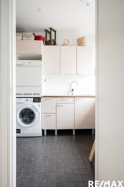 - Kodinhoitohuone on rakennettu vuonna 2010. Varustukseen kuuluu kaapistot, pesuallas paikka pesutornille, pesukone liitäntä. Seinät on maalattu ja lattia on laatoitettu.