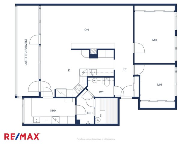 - Sälekaihtimet, kiinteät valaisimet, keittiön seinähyllyt, laskos verhot keittiö ja olohuone.