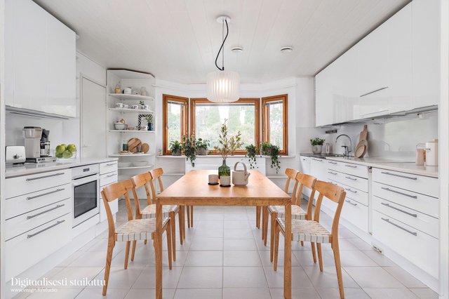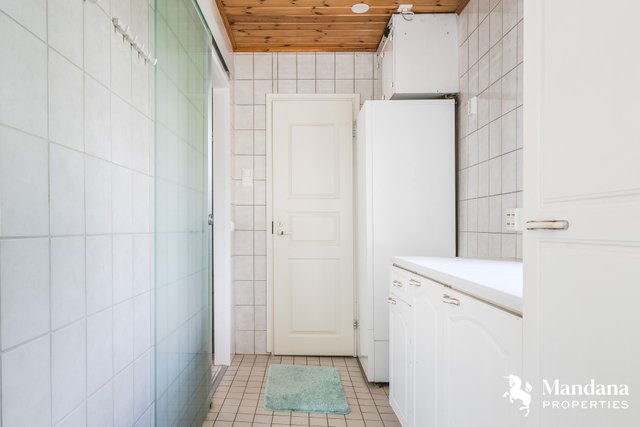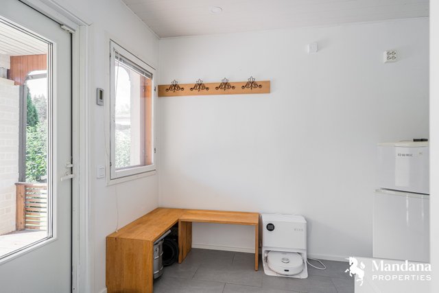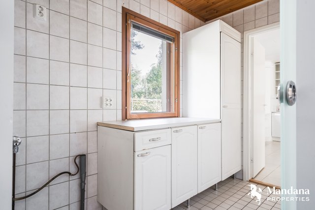 - Pesukoneliitäntä, lattialämmitys, pöytätaso, tila pesutornille, ja pyykkikaapit
