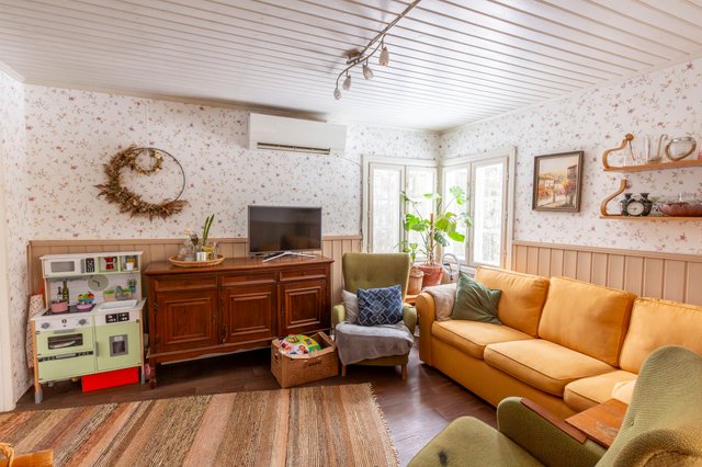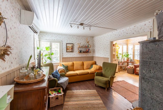 - Olohuoneessa varaava takka ja ilmalämpöpumppu.