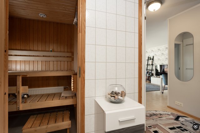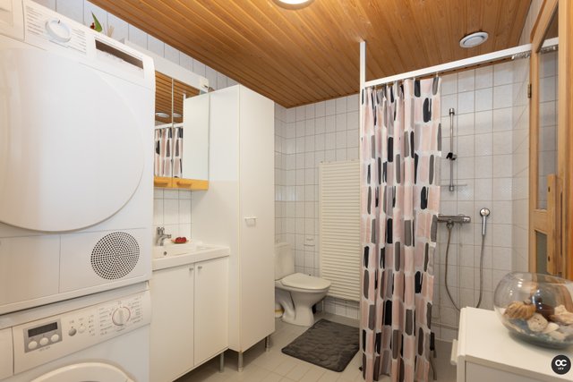 - WC-istuin, suihku, pesukoneliitäntä, lattialämmitys, peilikaappi, ja bidee-suihku
