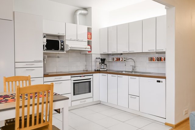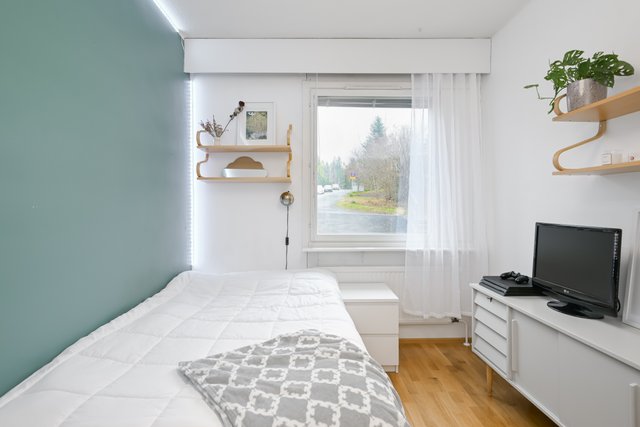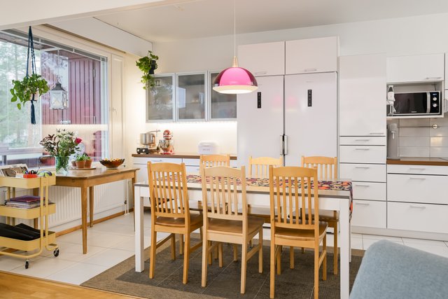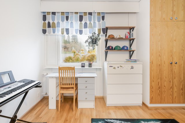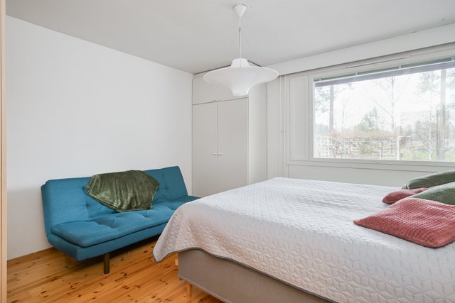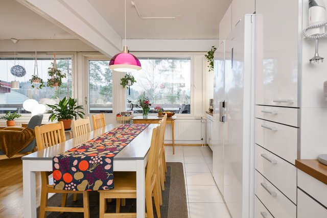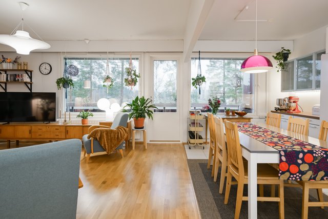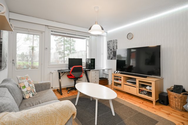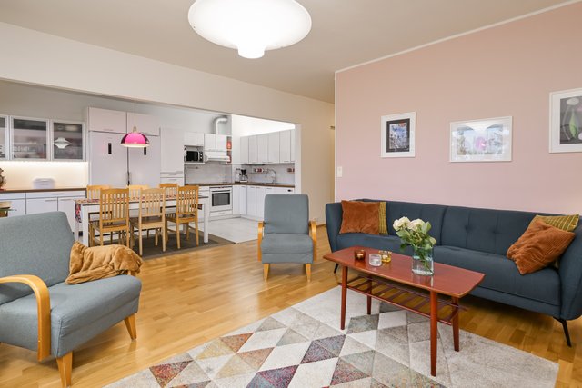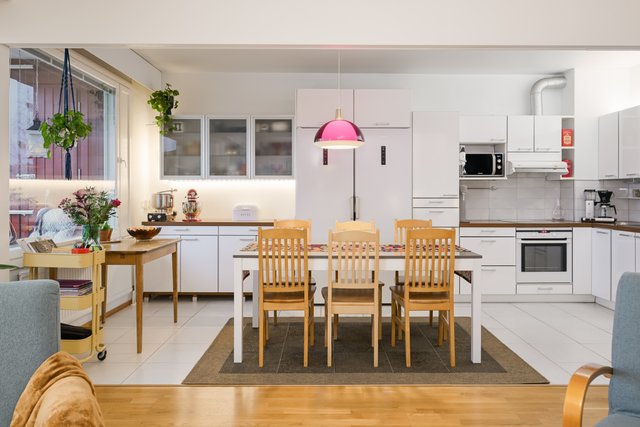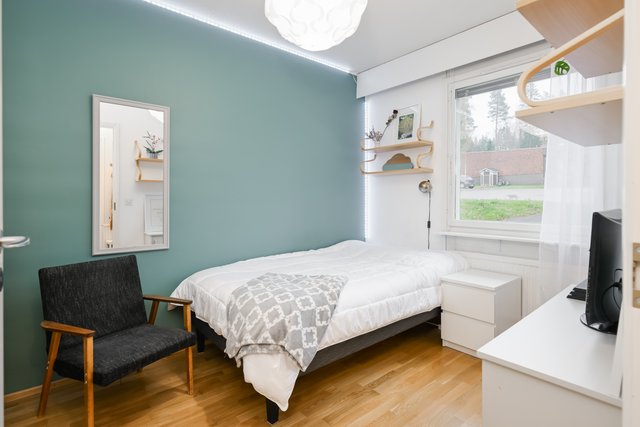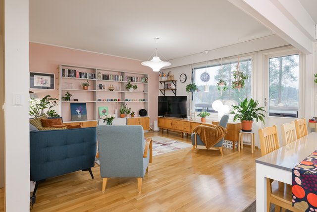 Sisään astuessa avautuu kodikas olohuone, jonka parkettilattia ja suuret ikkunat tuovat tilaan runsaasti luonnonvaloa. Keittiö on varustettu kaikilla tarvittavilla kodinkoneilla mikä tekee arjen askareista vaivattomia. Asunnossa on neljä makuuhuonetta, joten tilaa riittää isommallekin perheelle.