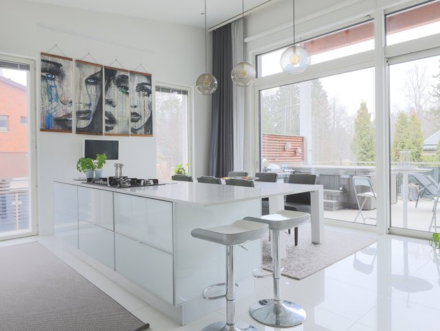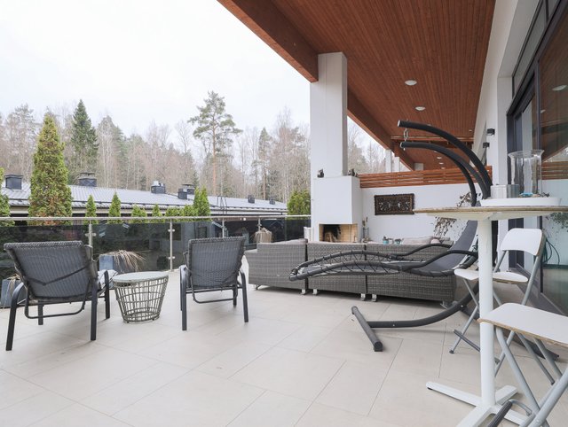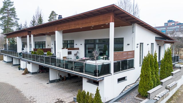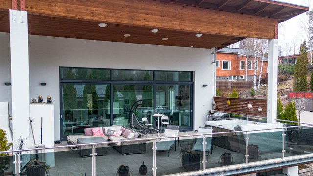 Talon keskiössä ovat yhteiset oleskelutilat, jotka kruunaa isot ikkunat, takka sekä huikea yli kolmen metrin huonekorkeus. Tilasta on käynti isolle terassille, josta löytyy poreamme ja ulkotakka tunnelmaa luomaan. Tyylikäs nykyaikainen avokeittiö, jossa on muun muassa Domuksen kaapistot, kivi tasot sekä kaasuliesi. Päämakuuhuoneen yhteydessä on walk-in closet sekä oma kylpyhuone.