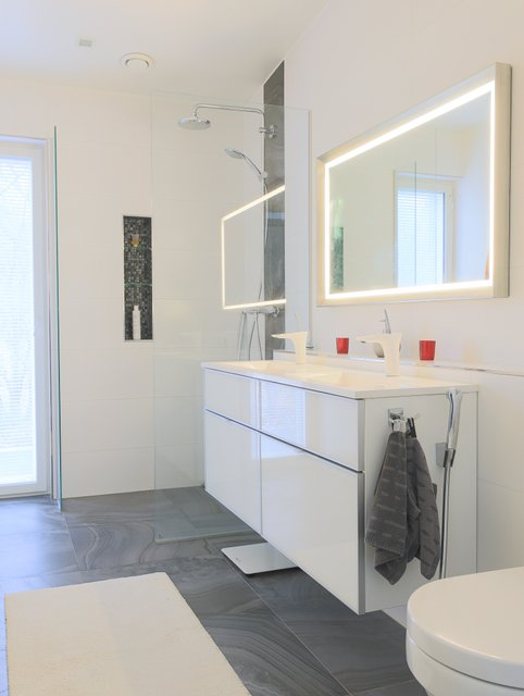 - 1.KERROS VARUSTUS: Suihku 2kpl, Amme, WC-istuin, Hana, Allaskaapisto, Kaapisto, Lattialämmitys. SEINÄT:Kaakeli. LATTIA: Laatta. ___ 2.KERROS VARUSTUS: Suihku, Suihkuseinä, Wc istuin, Peili Hana, Allaskaapisto, Lattialämmitys. Kaapisto. SEINÄT:Kaakeli. LATTIA: Laatta.