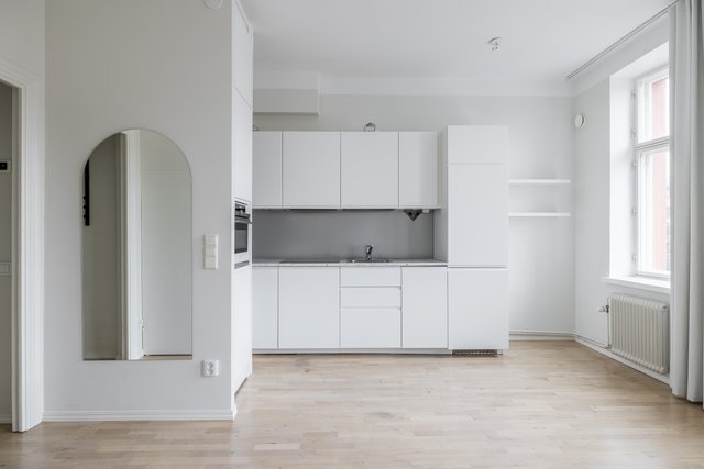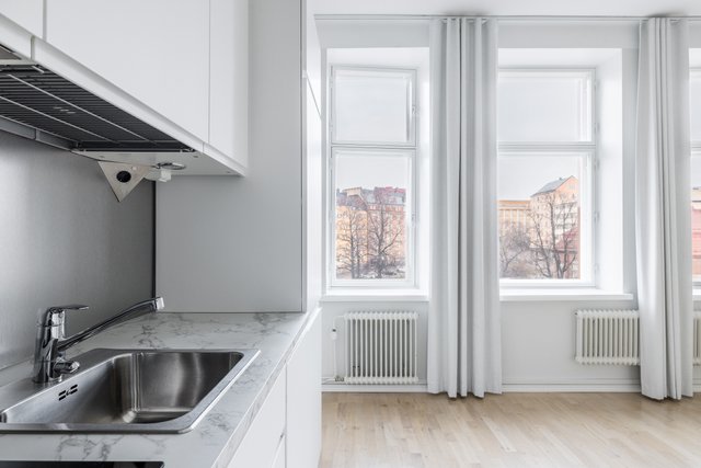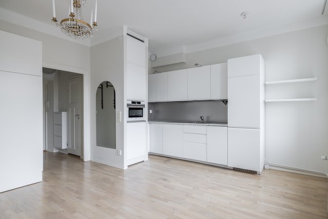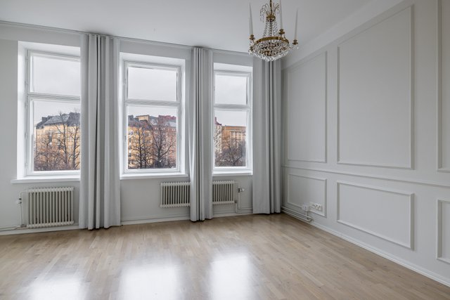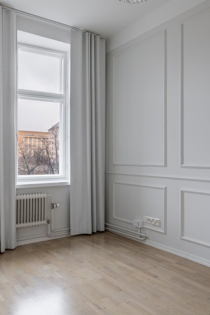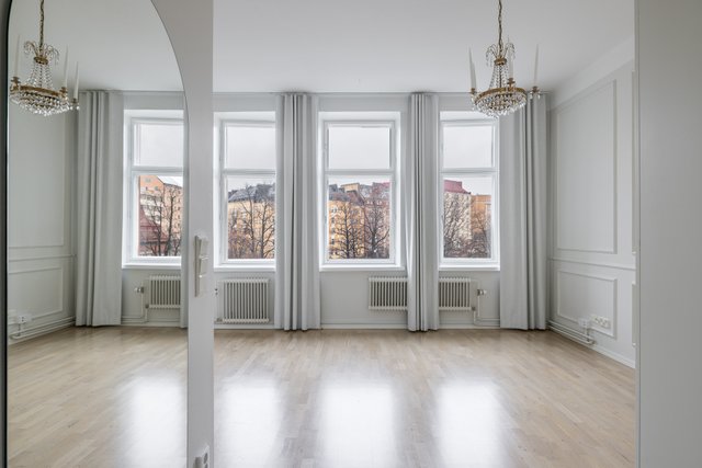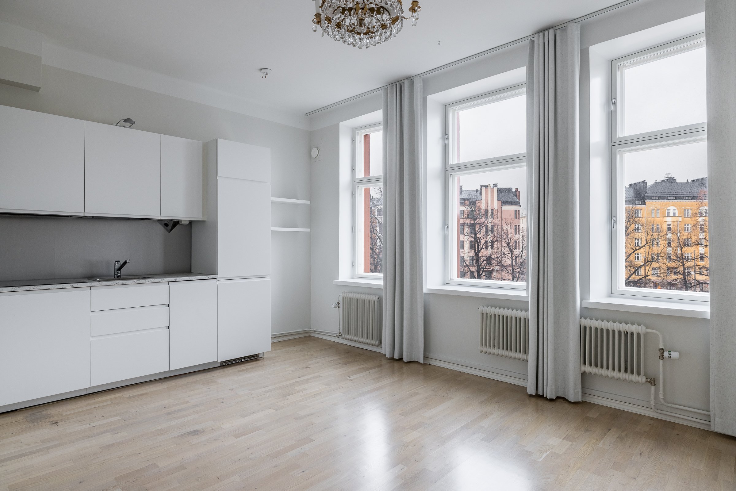 Asunnon kolme korkeaa ikkunaa avautuvat puistomaisemiin ja tuovat tilaan runsaasti luonnonvaloa, luoden asuntoon avaran ja viihtyisän tunnelman.