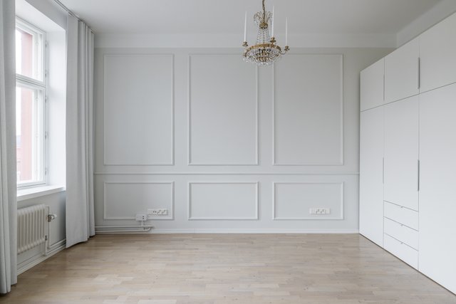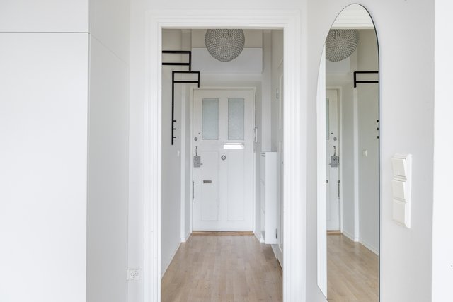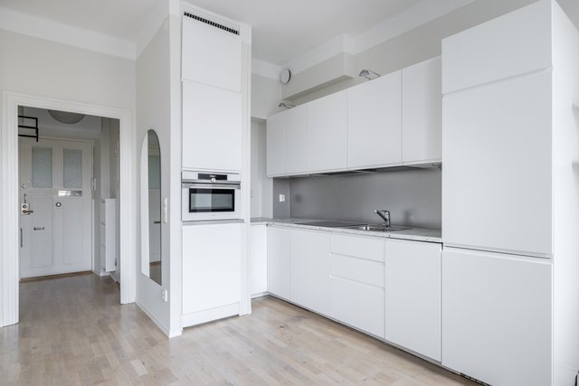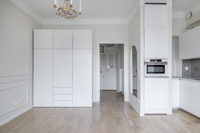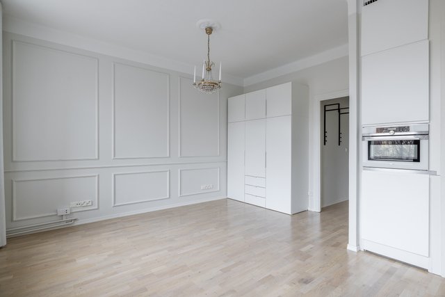 Olohuoneen seinien elegantti panelointi tuo asuntoon persoonallista ilmettä ja arvokkuutta. Tyylikäs ja hyvin varusteltu avokeittiö sulautuu luontevasti oleskelutilaan ja tarjoaa arkeen sujuvuutta.