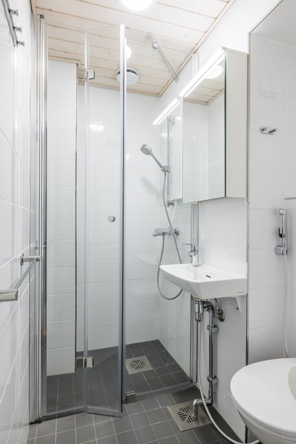 - WC-istuin, suihkuseinä, pesuallas, peilikaappi, bidee-suihku, lattialämmitys, ja suihku