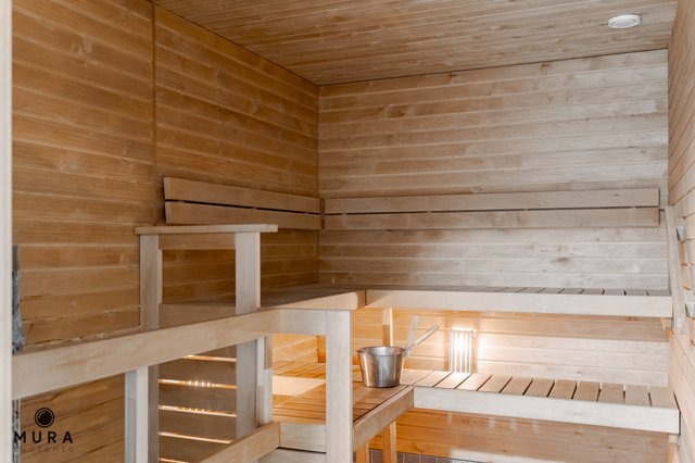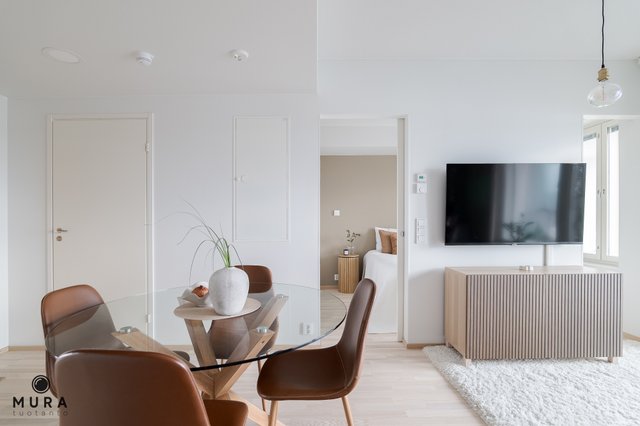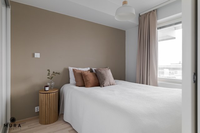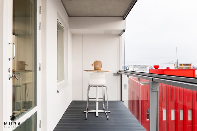 Kylpyhuone on sisustettu monen silmää miellyttävillä materiaaleilla tehosteseinineen, ja makuuhuoneeseen on kätevästi kaksi eri kulkua - molemmilta puolilta huonetta. Lasitettu parveke toimii lisätilana ja tarjoaa mukavan paikan rentoutua.