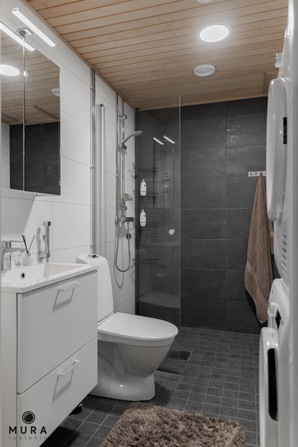 - WC-istuin, suihku, suihkuseinä, lattialämmitys, pesukoneliitäntä, ja peilikaappi