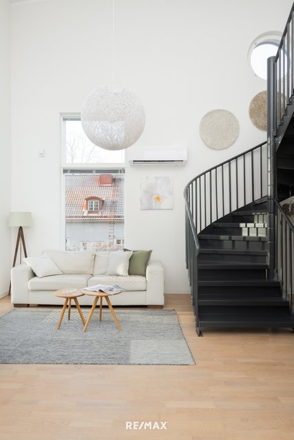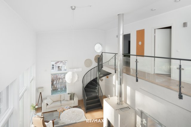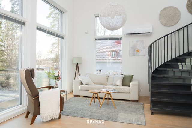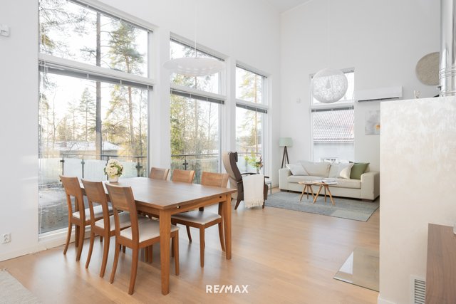 - Todella komea ja korkea tila, jossa yhteensä 45 m2 tila, jota hallitsee upea maisemaikkuna seinä. Tyylikkäitä yksityiskohtia esim. koko lasiovi, pyöreä ikkuna, rapattu tehosteseinä. Lämpöä ja tunnelmaa tuo kierto-ilmatakka. LATTIA: parketti SEINÄT: rapattu