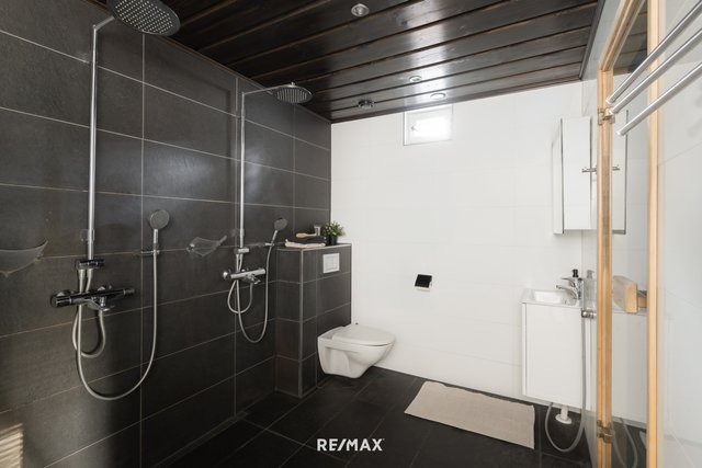 - Saunan tilava pesuhuone jossa erillinen pukutila lisäävät arjen toimivuutta. Uloskäynti suoraan takaterassille. VARUSTEET: kaksi suihkua, suihkuseinä, wc-istuin, käsisuihku, allaskaappi, peilikaappi LATTIA: laatta, lattialämmitys SEINÄT: laatta Yläkerrassa pukeutumishuone jonka yhteydessä meikkipiste. LATTIA: laatta SEINÄT: laatta / rappaus