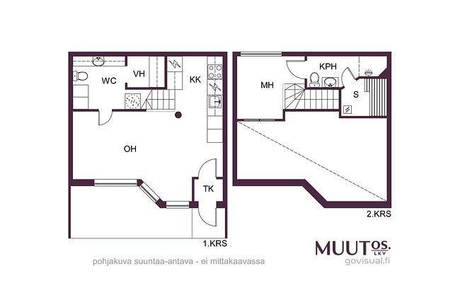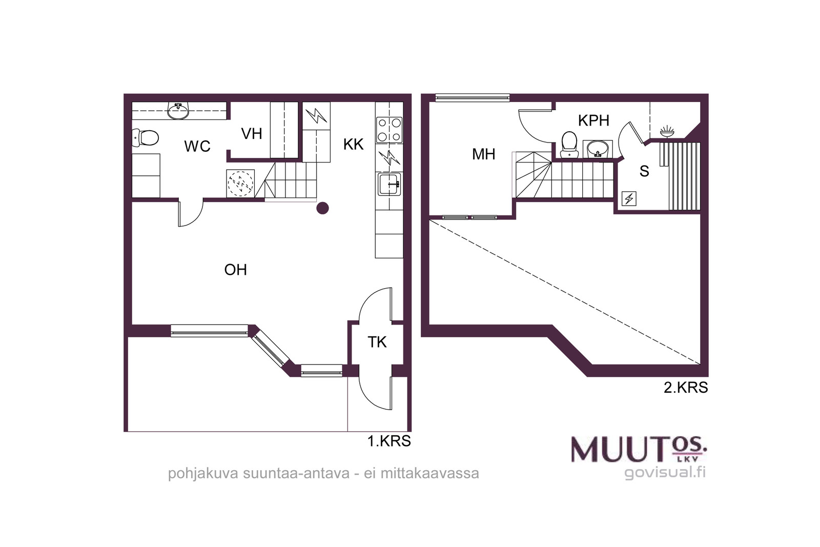 Asunnon alakerta on suunniteltu viihtymistä varten: avara olohuone yhdistyy vastikään remontoituun, moderniin keittiöön muodostaen tyylikkään ja valoisan oleskelualueen. Korkea huonekorkeus ja suuret ikkunat tuovat runsaasti luonnonvaloa ja luovat tilaan ilmavuutta. Alakerrasta löytyy lisäksi erillinen wc sekä käytännöllinen vaatehuonetila. Yläkerrassa sijaitsee makuuhuone, kylpyhuone sekä oma sauna, jossa voit rentoutua omassa rauhassa.