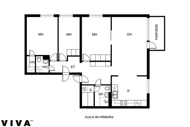 - Pinta-alatieto perustuu 18.11.2025 päivättyyn isännöitsijäntodistukseen ja yhtiöjärjestykseen. Pinta-aloja ei ole tarkistusmitattu. Pinta-alat saattavat tämän ikäisissä kohteissa (valmistunut ennen 1.1.1992) poiketa olennaisestikin asuinrakennusten nykyisten mittaustapojen ja standardien (SFS 5139) mukaan laskettavasta asuintilojen pinta-alasta. Pinta-ala voi siis olla edellä mainittua pienempi tai suurempi. Yhtiöjärjestyksen mukainen huoneistoselitelmä: 4h+k+s, 103,5 m².