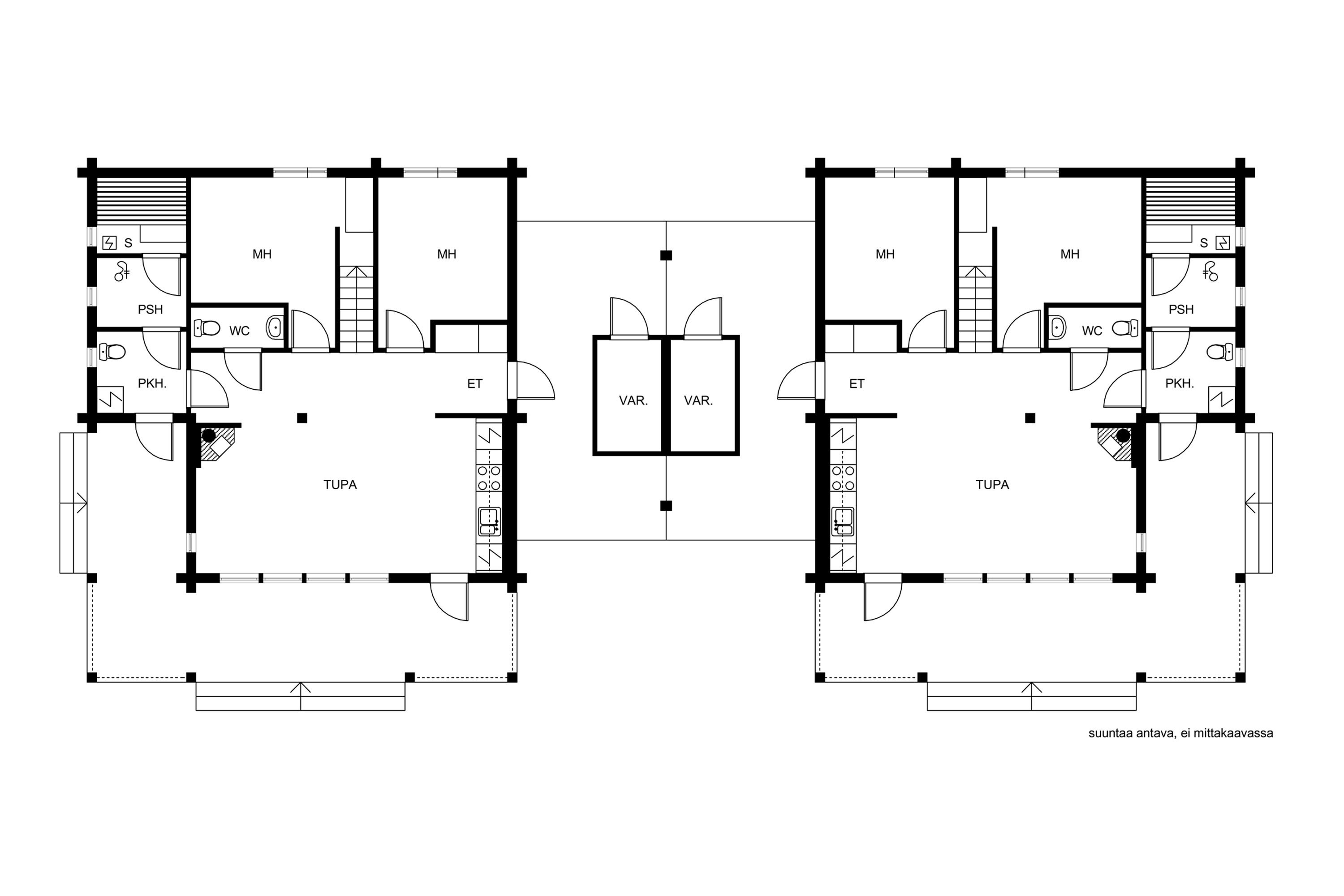 Huoneisto A: oh, k, 3 mh, pkh, ph, s, 2 wc, parvi, varasto Huoneisto B: oh, k, 3 mh, pkh, ph, s, 2 wc, parvi, varasto