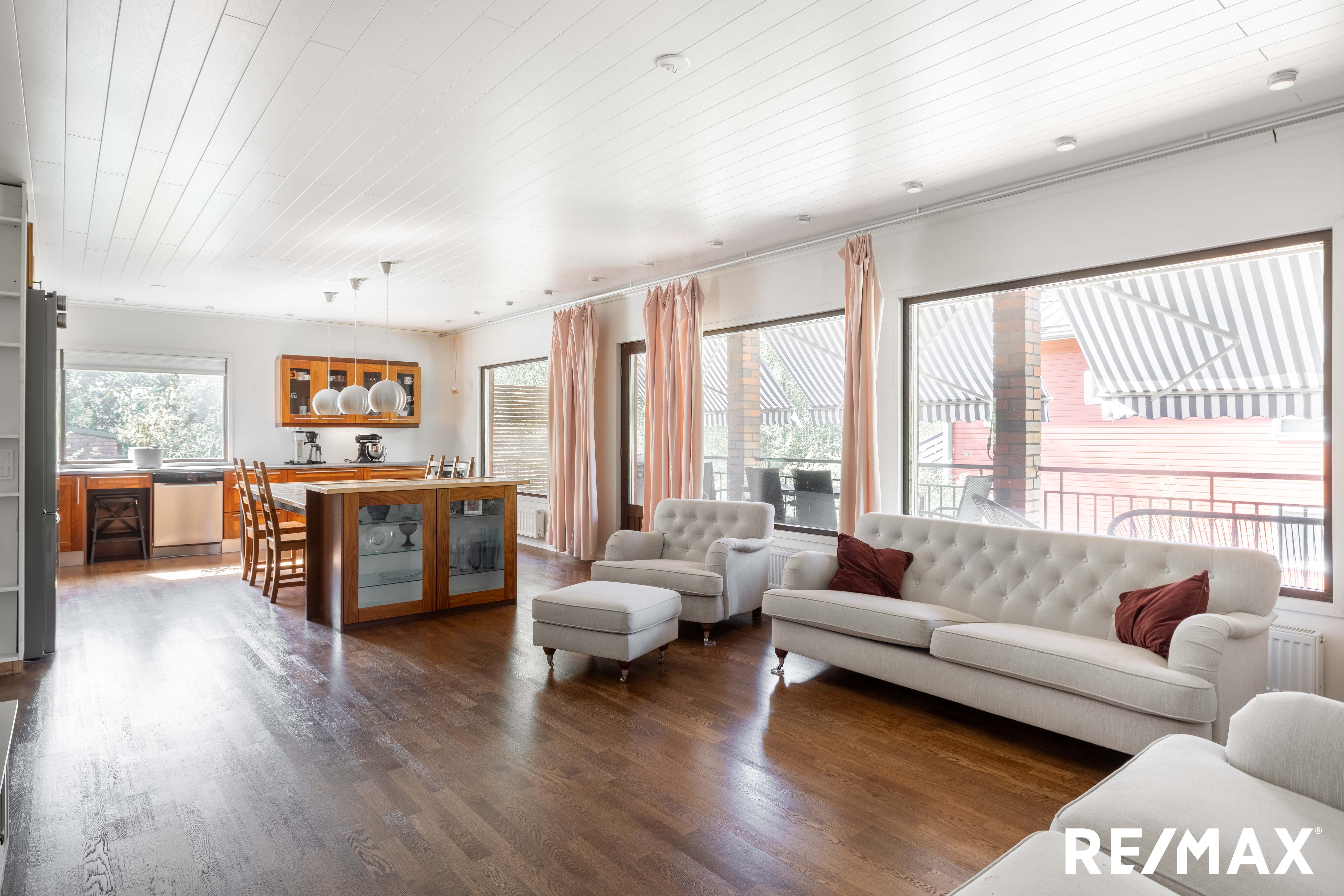 Talo tarjoaa mukavasti tilaa perheelle, sillä yläkerrassa on 104 m² asuintilaa ja alakerrassa 76 m² asumista palvelevaa tilaa, johon kuuluu myös varasto, kellari ja autotalli.