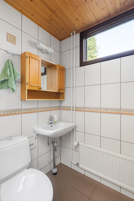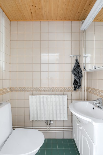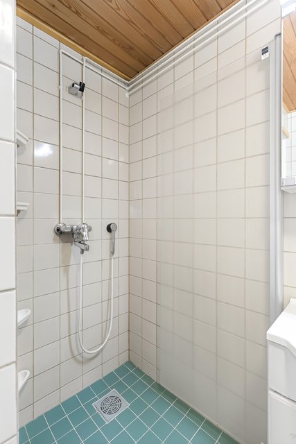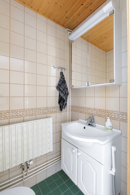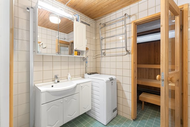 - Yläkerrassa pesutila, jonka varusteisiin kuuluu: suihku, kääntyvä suihkuseinä, peilikaappi, allaskaapisto, pyyhekuivain, pesukoneliitäntä Seinät: kaakeli Lattia: laatta