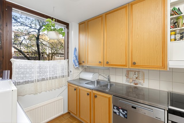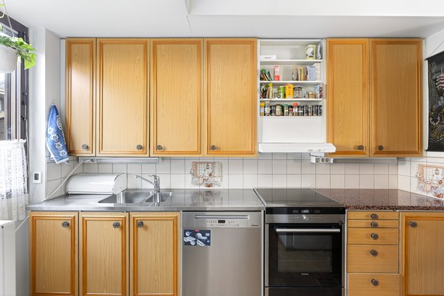 - Keittiön varusteisiin kuuluu: jääkaappi/pakastin, lattialiesi, liesituuletin, astianpesukone, kiinteät valaisimet Työtaso: kivi/metalli Välitila: kaakeli Seinät: maalattu Lattia: parketti