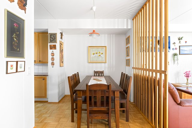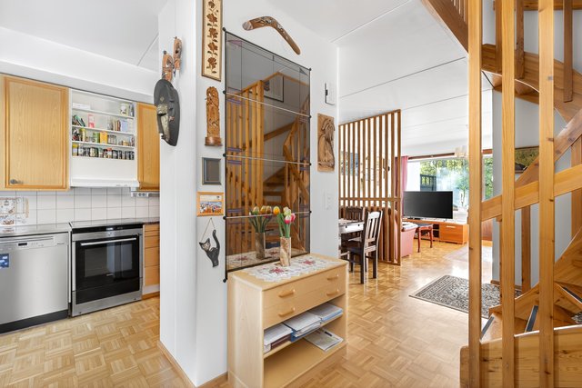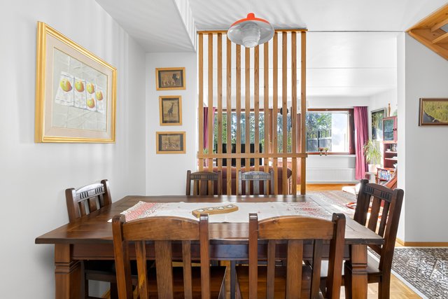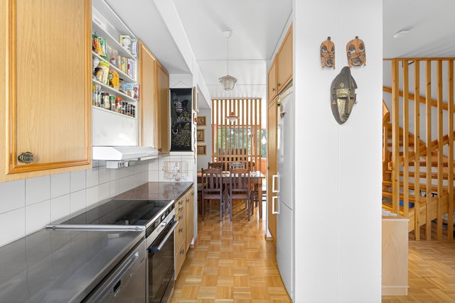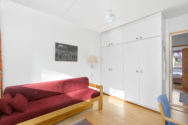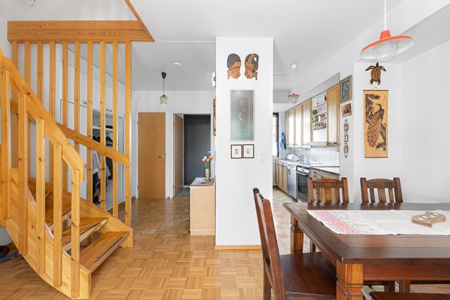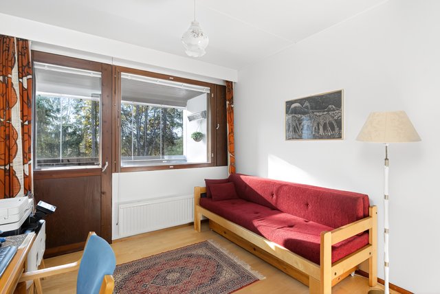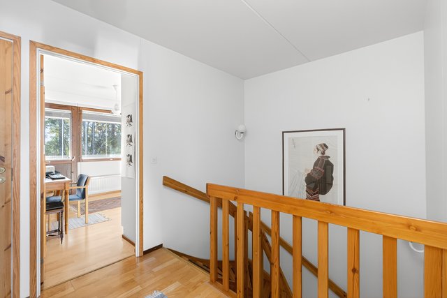 Keittiö on varusteltu käytännöllisesti, ja yläkerran makuuhuoneet tarjoavat rauhallisen paikan levätä. Yläkerrassa on kolme makuuhuonetta, joista kaksi on yhdistetty yhdeksi isoksi huoneeksi. Seinä on helppo palauttaa jo vaikka ennen asunnon vapautumista, ja huoneiden välillä on tällä hetkellä iso haitariovi. Asunnossa on myös oma ikkunallinen sauna, joka tarjoaa rentouttavat löylyt.