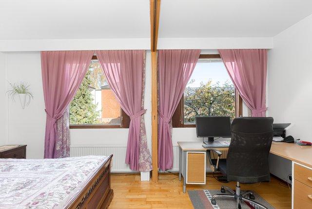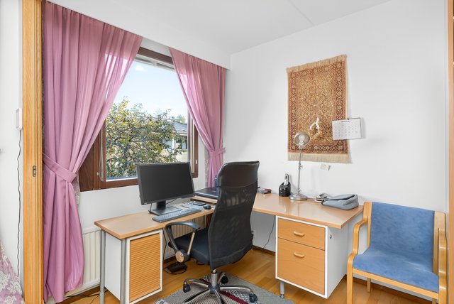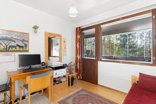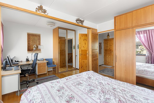 - Yläkerrassa on kaksi makuuhuonetta, joista toisesta on sermiseinällä erotettavissa huonetila, joka sopii mainiosti esim. toimistoksi. Makuuhuoneissa on liukuovelliset vaatekaapit säilytystilaa tuomassa. Seinät: maalattu Lattia: parketti