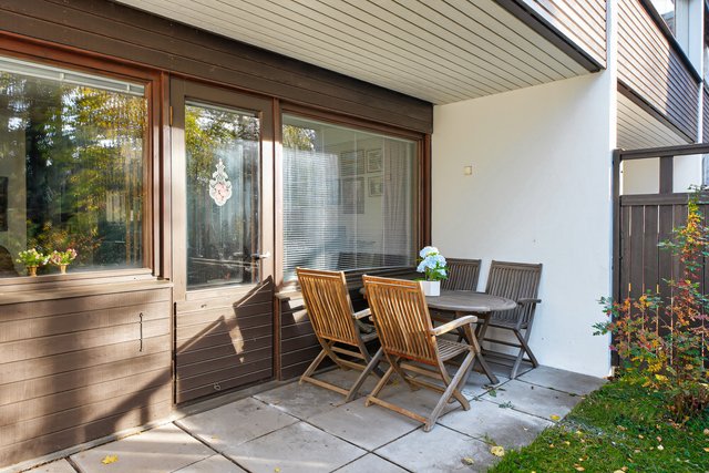 Tämä kaksikerroksinen koti tarjoaa mukavat puitteet perheelle tai pariskunnalle. Asunnossa on tilava olohuone, josta pääsee suoraan omalle terassille ja pihalle, sekä lasitettu parveke, josta avautuvat näkymät vehreälle piha-alueelle.