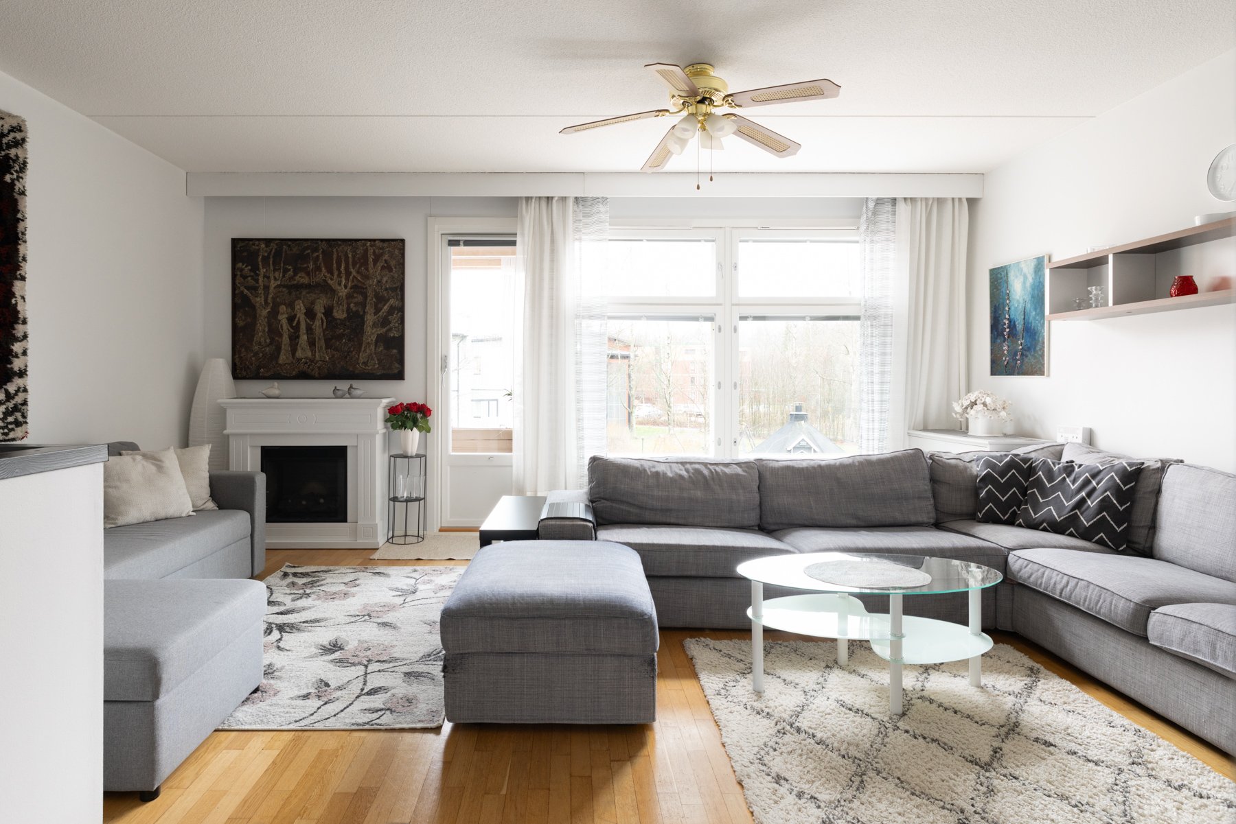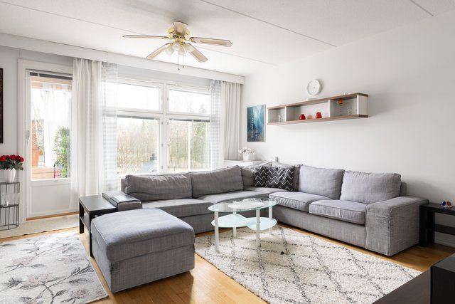 Avara ja valoisa rivitalon huoneisto loistavalla pohjaratkaisulla. Toimivat tilat jakautuvat kahteen kerrokseen, oleskelutilat ovat yläkerrassa.