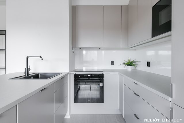 - Varustus: Integroidut kodinkoneet: jääkaappi/pakastin, astianpesukone, mikroaaltouuni, induktioliesitaso ja erillisuuni, liesituuletin.