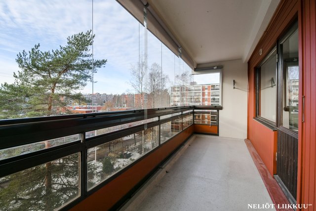 Asunnon juuri remontoitu, lasitettu iso parveke on oma rauhallinen lisähuoneensa, jossa on ihana vilvoitella saunan jälkeen tai nauttia kiireettömästä aamukahvista kesäaamujen lempeässä valossa.