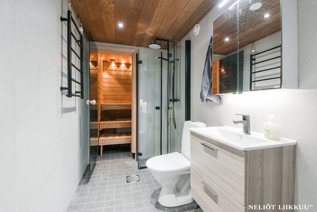 - Varustus: suihku, suihkuseinä, allas ja allaslaatikosto, peilikaappi, wc-istuin, pyyhekuivain, lattialämmitys.