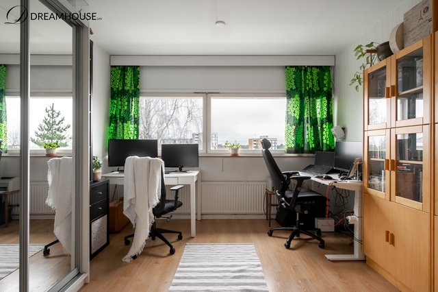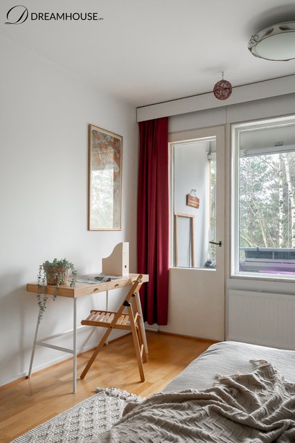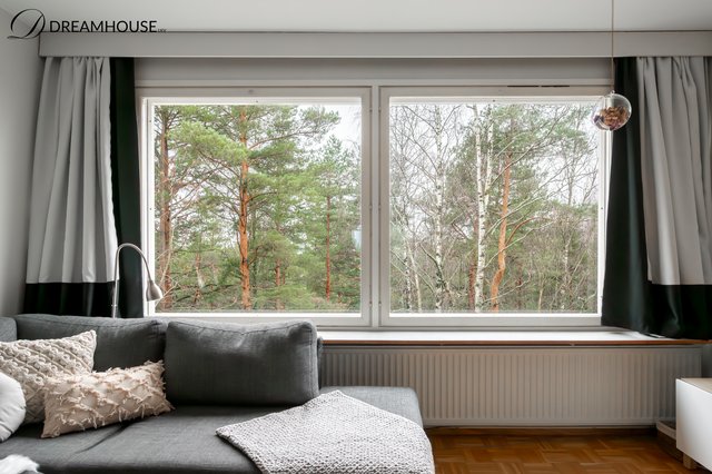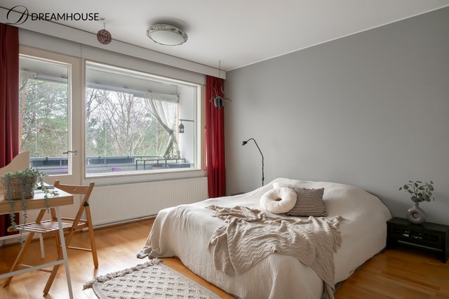 Ylimmän kerroksen valoisa ja lämminhenkinen kolmio tarjoaa kodikkaan pesäpaikan rauhallisen ja vehreän Pihlajamäen sydämessä. Asunnossa on kaksi isoa makuuhuonetta ja molemmissa on oma vaatehuone, käytännöllinen keittiö, kylpyhuone ikkunalla sekä lasitettu parveke, jolta avautuu rauhoittava metsänäkymä. Ikkunoista tulvii luonnonvaloa, ja näkymät tuovat ripauksen luonnon rauhaa osaksi arkea.