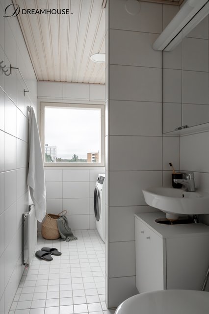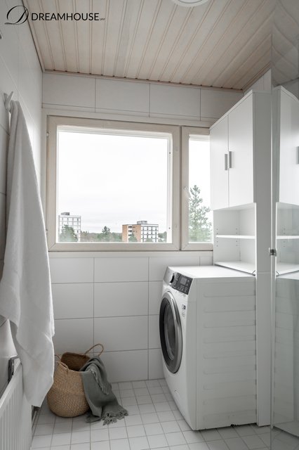 - WC-istuin, suihku, pesukone, pesukoneliitäntä, pesuallas, bidee-suihku, suihkuseinä, peilikaappi, ja allaskaappi