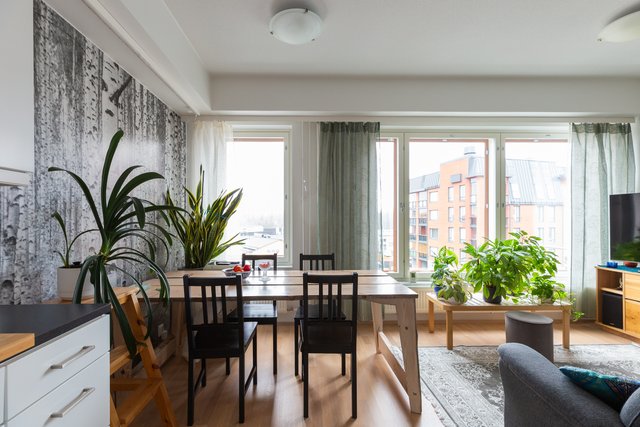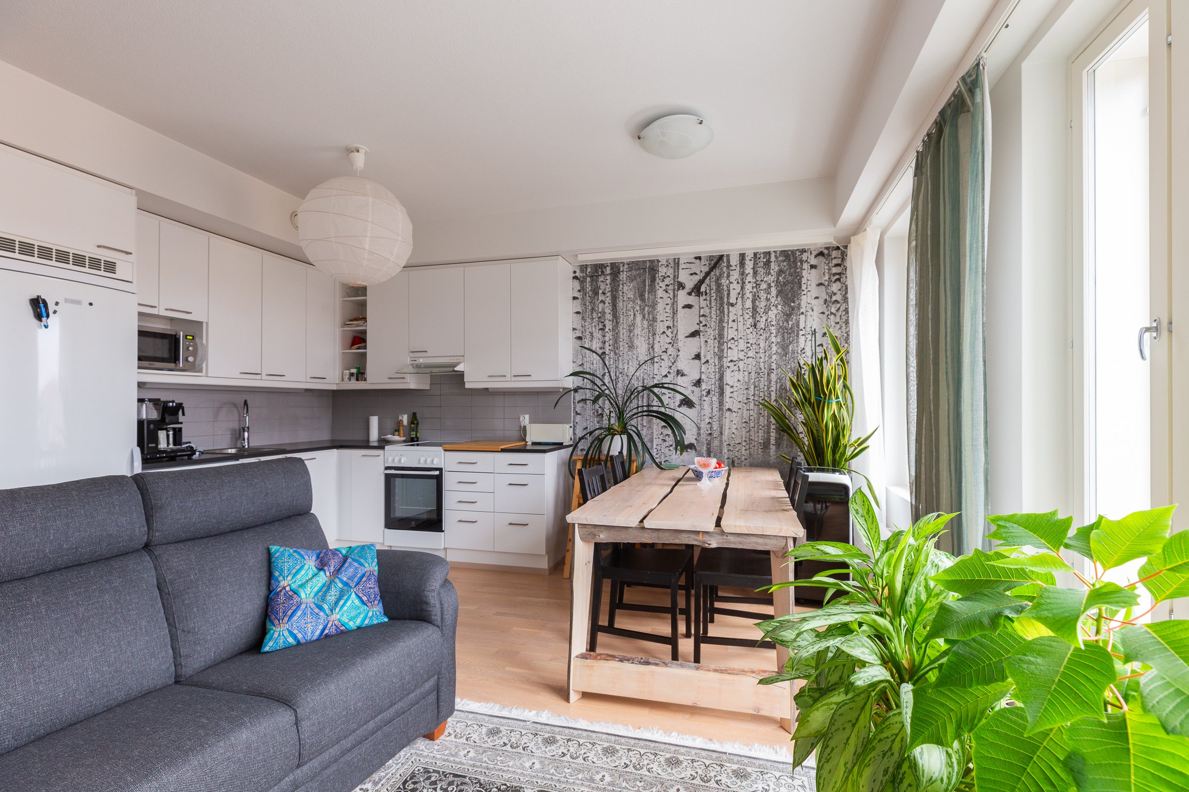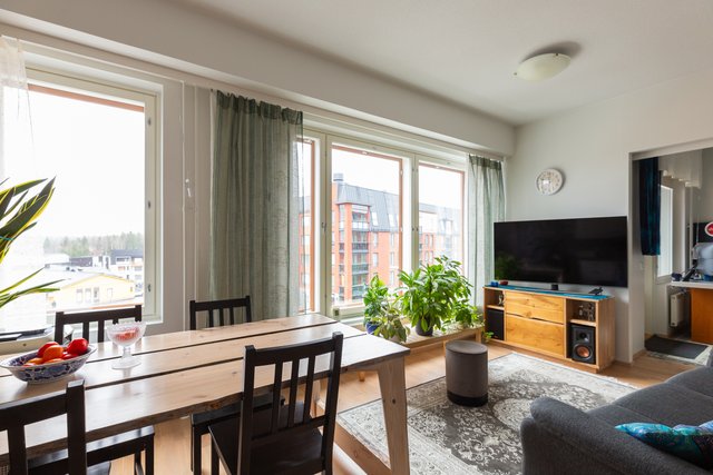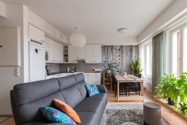 Asunnon pohjaratkaisu on toimiva ja avara, ja oma sauna tuo lisämukavuutta arkeen. Hyvin varusteltu keittiö tekee ruoanlaitosta vaivatonta. Olohuone ja makuuhuone ovat tilavia ja niiden laminaattilattiat luovat yhtenäisen ilmeen. Kylpyhuone on laatoitettu ja sieltä löytyy kaikki tarpeellinen, kuten pesukoneliitäntä.