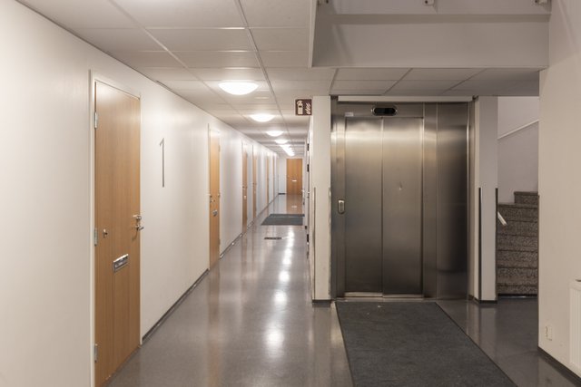 2023 Lämmönvaihdin uusittu, portaiden valistus, hissin ovikorjaus