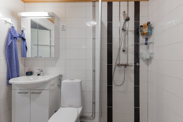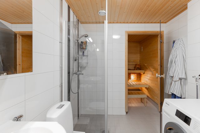 - WC-istuin, suihkuseinä, pesukoneliitäntä, pesuallas, peilikaappi, allaskaappi, ja bidee-suihku
